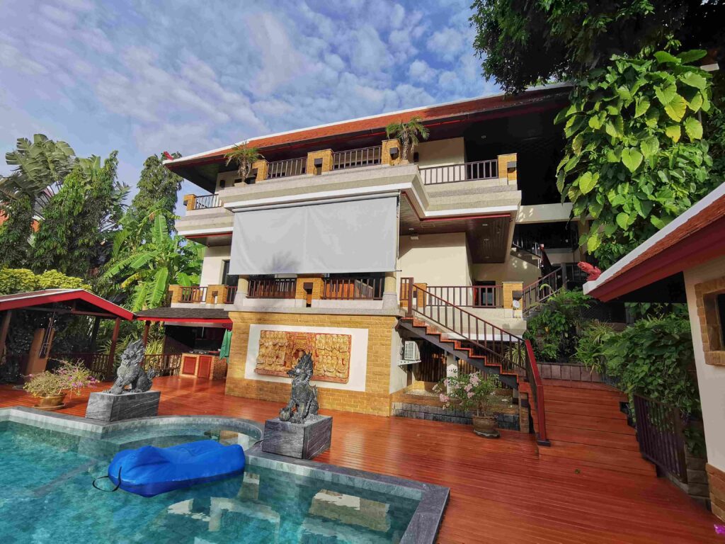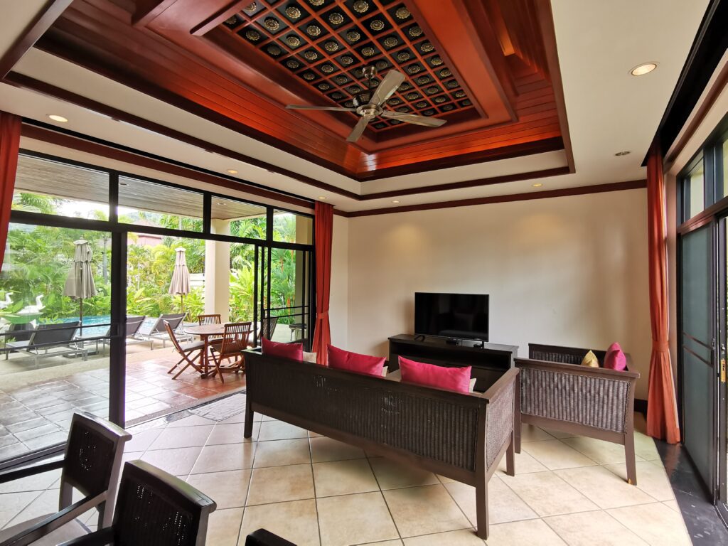Thai style villa 2 km from Nai Harn beach, 465 sq. meters of land, villa area 300 sq. meters, parking, 3 bedrooms, 3 bathrooms, swimming pool. Large gated complex. This villa is in perfect condition. Very comfortable for long term stay.